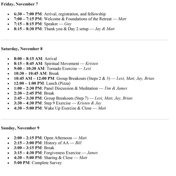 The weekend begins with fellowship and an inspiring speaker focused on emotional sobriety. It’s a time to settle in, connect with others, and set the mood for a weekend of healing and reflection.